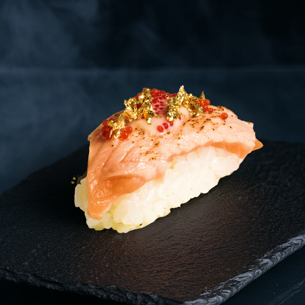 Разбавляем серость будней золотым блеском и сочным лососем. Немного огня — и твой вечер становится праздником.Состав: Рис, лосось, соус Унаги майо, тобико, сусальное золото.