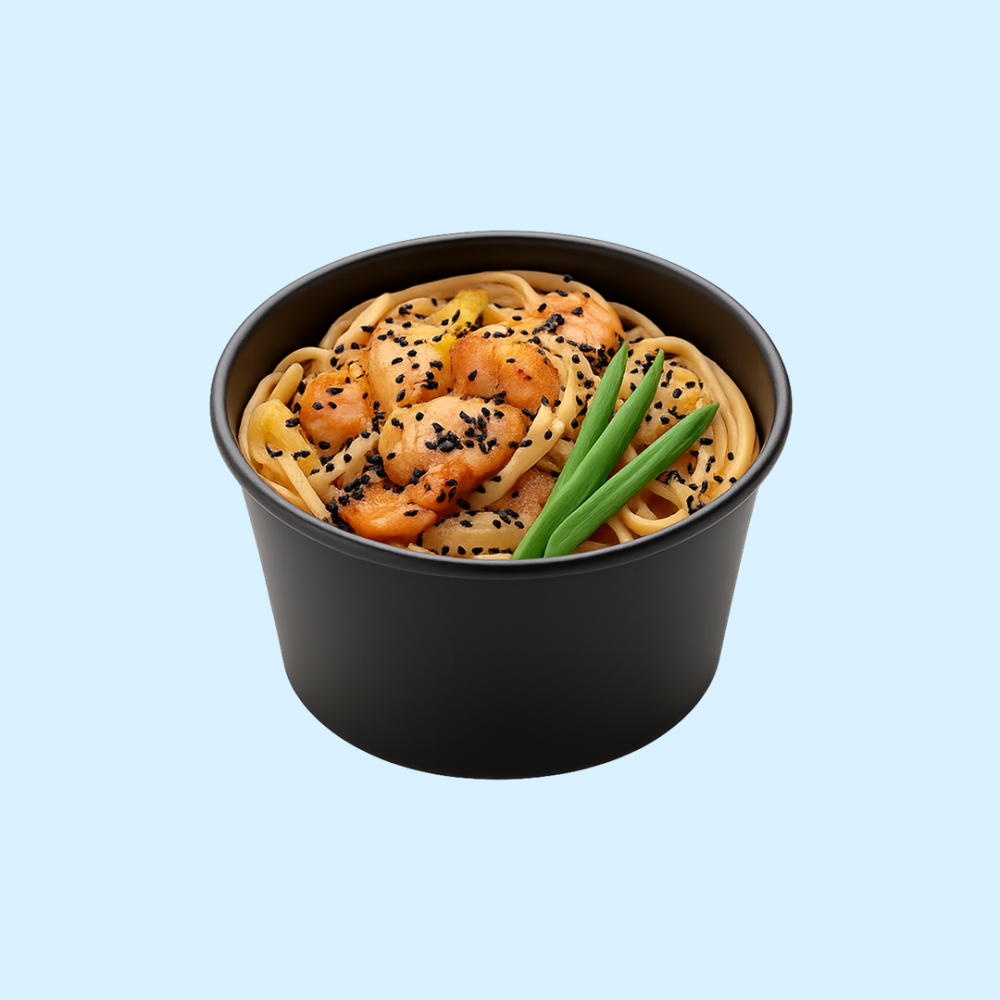 Лапша удон, лосось, крахмал, лук зелёный, шампиньон, перец болгарский, соус терияки, кунжут ч/б