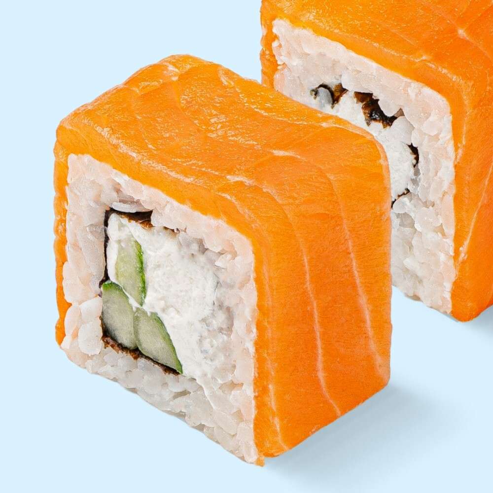 Рис, мицукан, сахар, комбу, соль, нори, сыр сливочный, огурец, лосось холодного копчения