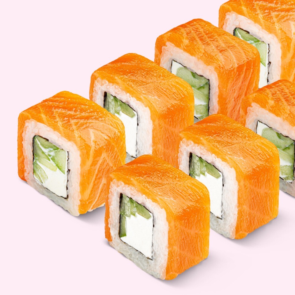 Рис, мицукан, сахар, комбу, соль, нори, сыр сливочный, огурец, лосось