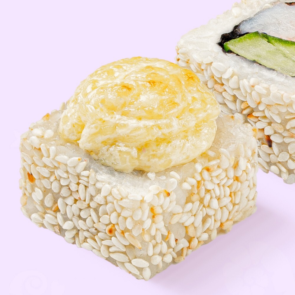 Рис, мицукан, сахар, комбу, соль, нори, креветка, огурец, кунжут белый, сыр гауда, майонез