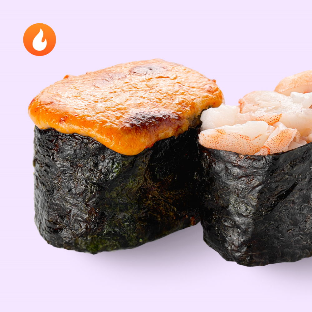 Рис, мицукан, сахар, комбу, соль, нори, креветка, сыр гауда, майонез, паста кимчи
