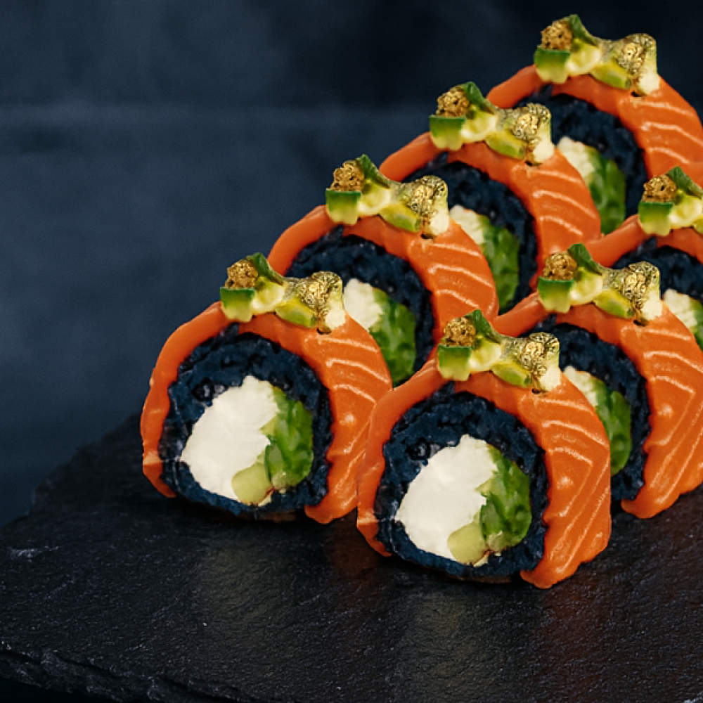 Давно мечтали попробовать настоящие золотые слитки? Закажите роллы с сусальным золотом, мечты должны сбываться! Состав: Нори, чёрный рис, сливочный сыр, огурец, лосось, сусальное золото, соус Унаги майо, тартар из огурца.