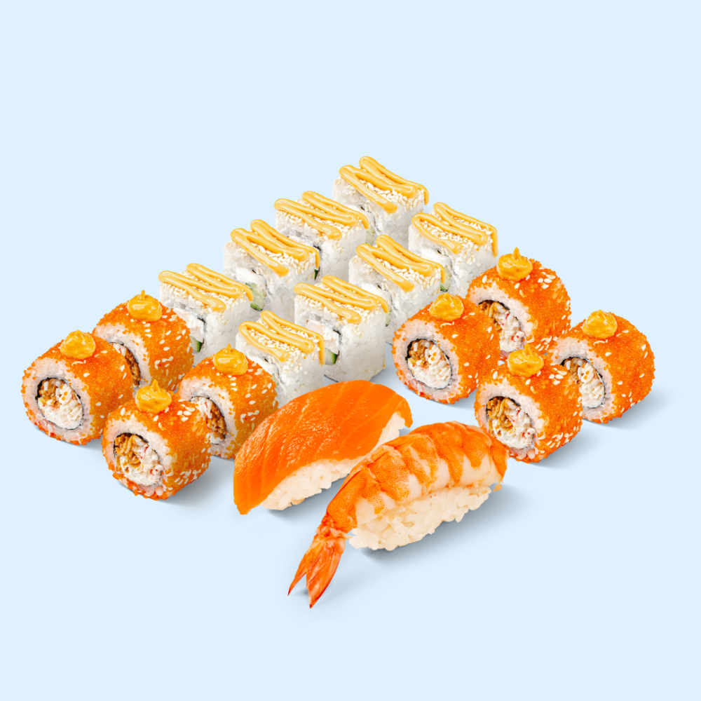 Морской сет с лососем, крабом и креветкой для романтического вечера со второй половинкой. Состав: Калифорния кранч том ям, Креветка 1000 островов, Эби, Сяке