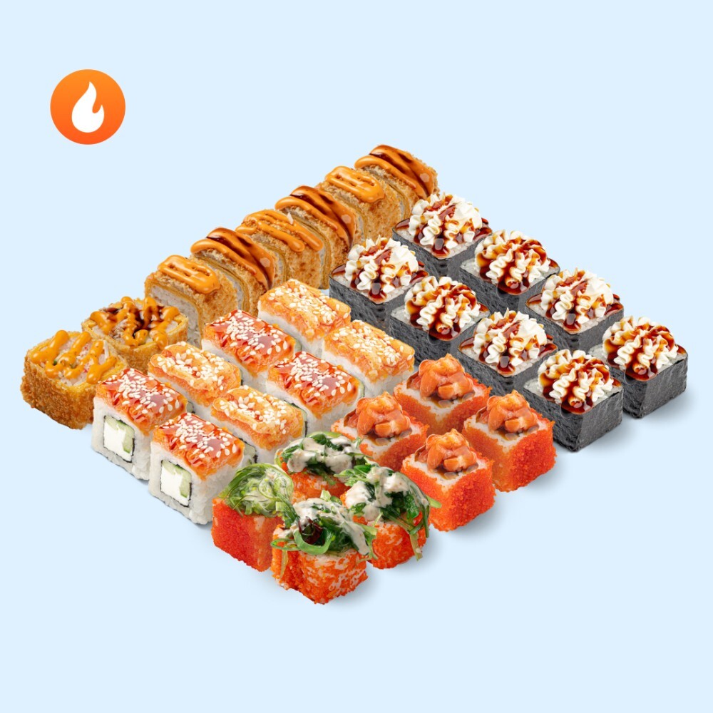 Губы сами растягиваются в довольную улыбку, когда читаешь состав этого щедрого сета с лососем и морепродуктами. Состав: Чуколось, Краб темпура, Сочный краб терияки, Лосось спайс